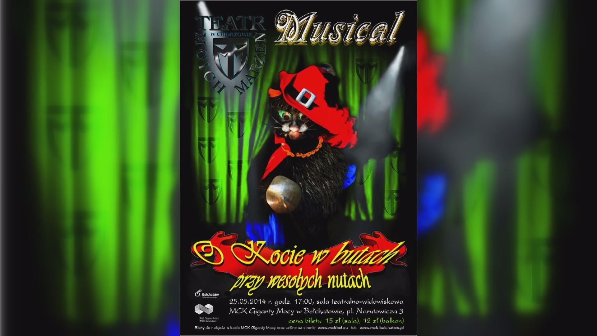 Natomiast 25.05.2014 o godz. 17:00, w sali teatralno-widowiskowej MCK Giganty Mocy będzie można obejrzeć barwny musical „O kocie w butach przy wesołych nutach” Spektakl muzyczny w wykonaniu Teatru Moich Marzeń z Chorzowa to barwna opowieść o Adamie i jego niezwykłym kocie, który nie dość, że potrafi mówić to jeszcze pragnie spełnić marzenie swojego opiekuna i pomóc mu zdobyć serce pięknej królewny Leny.