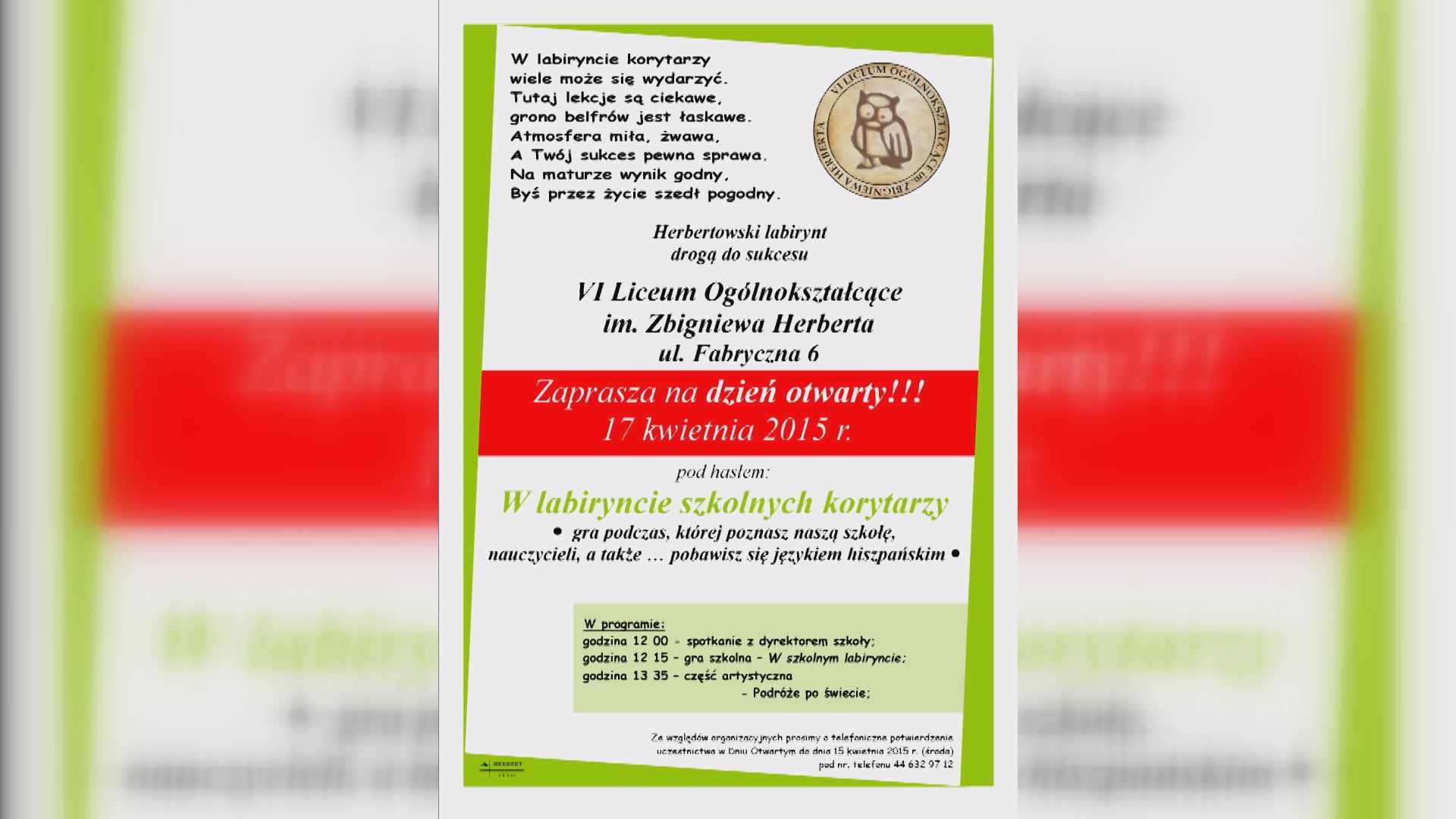 VI Liceum Ogólnokształcące im. Zbigniewa Herberta ponownie otworzy swoje. Tym razem "Dzień otwarty" będzie przebiegał pod hasłem „ W labiryncie szkolnych korytarzy”.