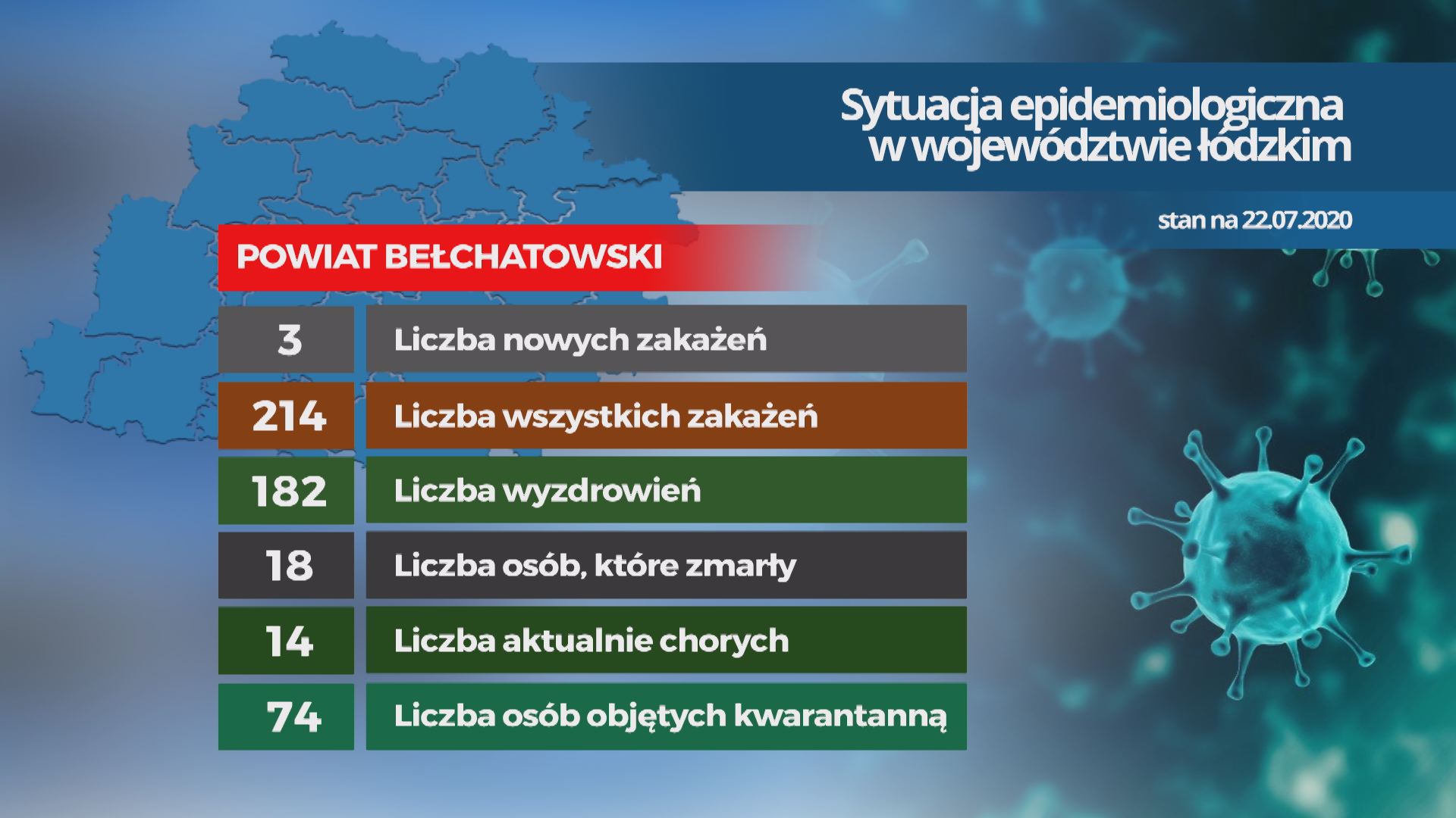 W powiecie bełchatowskim potwierdzono wczoraj 3 nowe zakażenia. Dotychczas koronawirusa stwierdzono u 214 mieszkańców powiatu. 182 osoby wyzdrowiały. Aktualnie 14 osób ma dodatni wynik testów. Zmarło 18 pacjentów zakażonych koronawirusem.