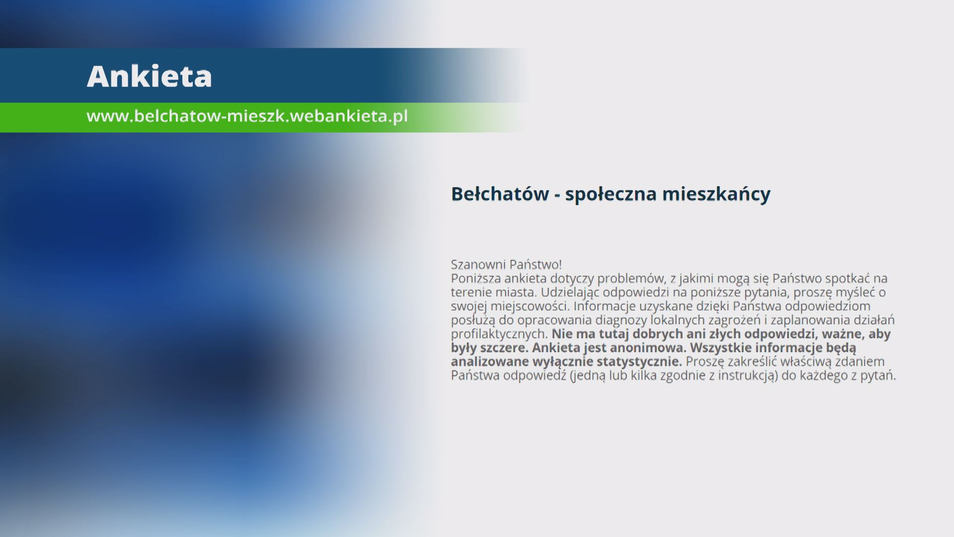 Ankieta jest dostępna na stronie internetowej bełchatowskiego magistratu. Nie trzeba w niej podawać imienia i nazwiska. Jak zaznaczają urzędnicy uzyskane w ten sposób informacje posłużą tylko do opracowania wspomnianej diagnozy lokalnych zagrożeń i zaplanowania działań profilaktycznych. Wszystkie informacje będą analizowane wyłącznie statystycznie.