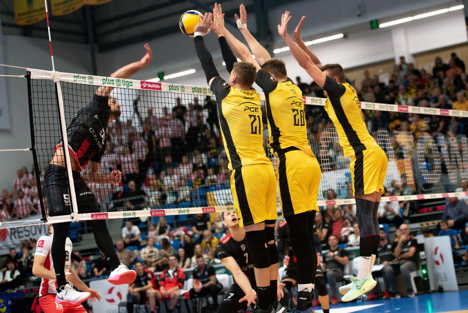 PGE Skra: Karol Kłos, Dick Kooy, Aleksandar Atanasijević, Grzegorz Łomacz, Mateuz Bieniek, Filippo Lanza i Jędrzej Gruszczyński (l) oraz Jakub Rybicki, Wiktor Musiał, Mihajlo Mitić, Lukas Vasina.