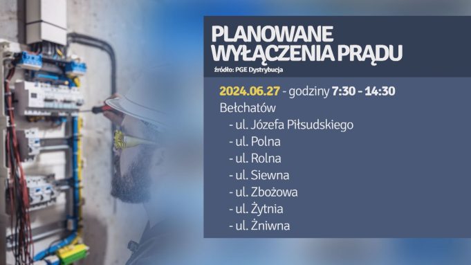 W czwartek, 27 czerwca, w Bełchatowie planowane są kilkugodzinne przerwy w dostawie prądu. Jak informuje operator, energii elektrycznej mogą nie mieć mieszkańcy kilku bełchatowskich ulic.