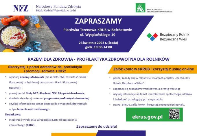 W środę, 23 kwietnia 2025 roku, w godzinach od 10:00 do 14:00, w siedzibie Placówki Terenowej KRUS w Bełchatowie przy ulicy Wyspiańskiego 19 odbędzie się wydarzenie poświęcone zdrowiu, profilaktyce i bezpieczeństwu rolników.