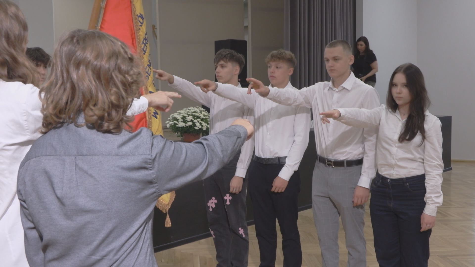 Podczas uroczystej akademii w auli szkoły uczniowie klas pierwszych złożyli ślubowanie, stając się pełnoprawnymi członkami społeczności szkolnej.