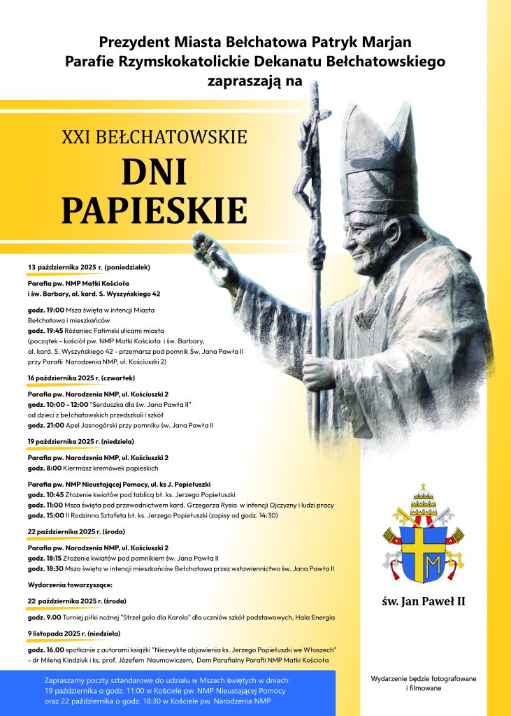 Jednym z tradycyjnych punktów programu będzie spotkanie przedszkolaków przy pomniku Jana Pawła II. Już jutro, 16 października, najmłodsi mieszkańcy Bełchatowa przyjdą z własnoręcznie wykonanymi, kolorowymi serduszkami, którymi ozdobią pomnik papieża. Wydarzenie odbędzie się przy kościele pw. Narodzenia Najświętszej Maryi Panny przy ulicy Kościuszki.