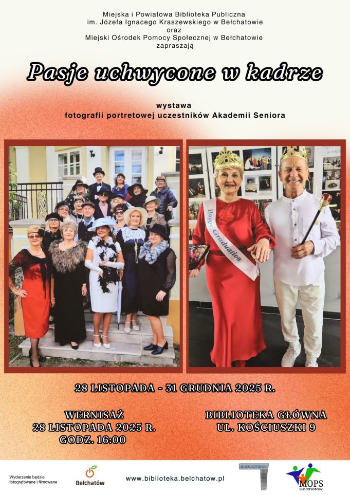 Miejska i Powiatowa Biblioteka Publiczna w Bełchatowie zaprasza na wystawę fotografii portretowej uczestników Akademii Seniora pt. „Pasje uchwycone w kadrze”.