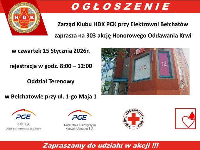 Zarząd Klubu HDK PCK przy Elektrowni Bełchatów zaprasza do udziału w 303. akcji Honorowego Oddawania Krwi. Akcję zaplanowano w czwartek, 15 stycznia, rejestracja dawców prowadzona będzie w godzinach od 8.00 do 12.00 w Oddziale Terenowym RCKiK w Bełchatowie przy ul. 1-go Maja 1.
