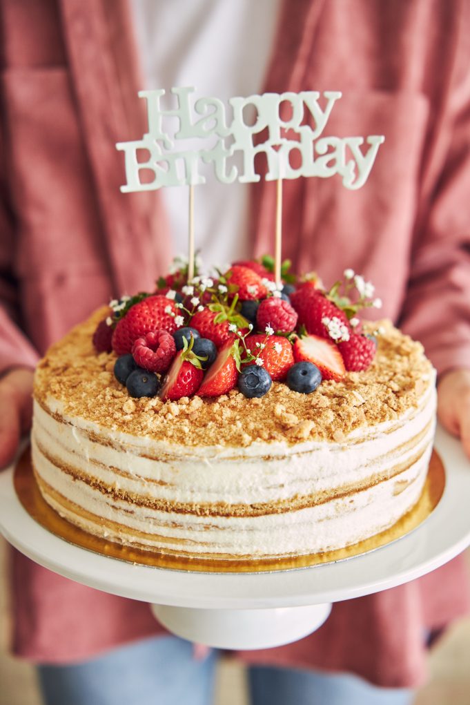 A closeup of a person holding the fruity cake with a "Happy Birthday" topper