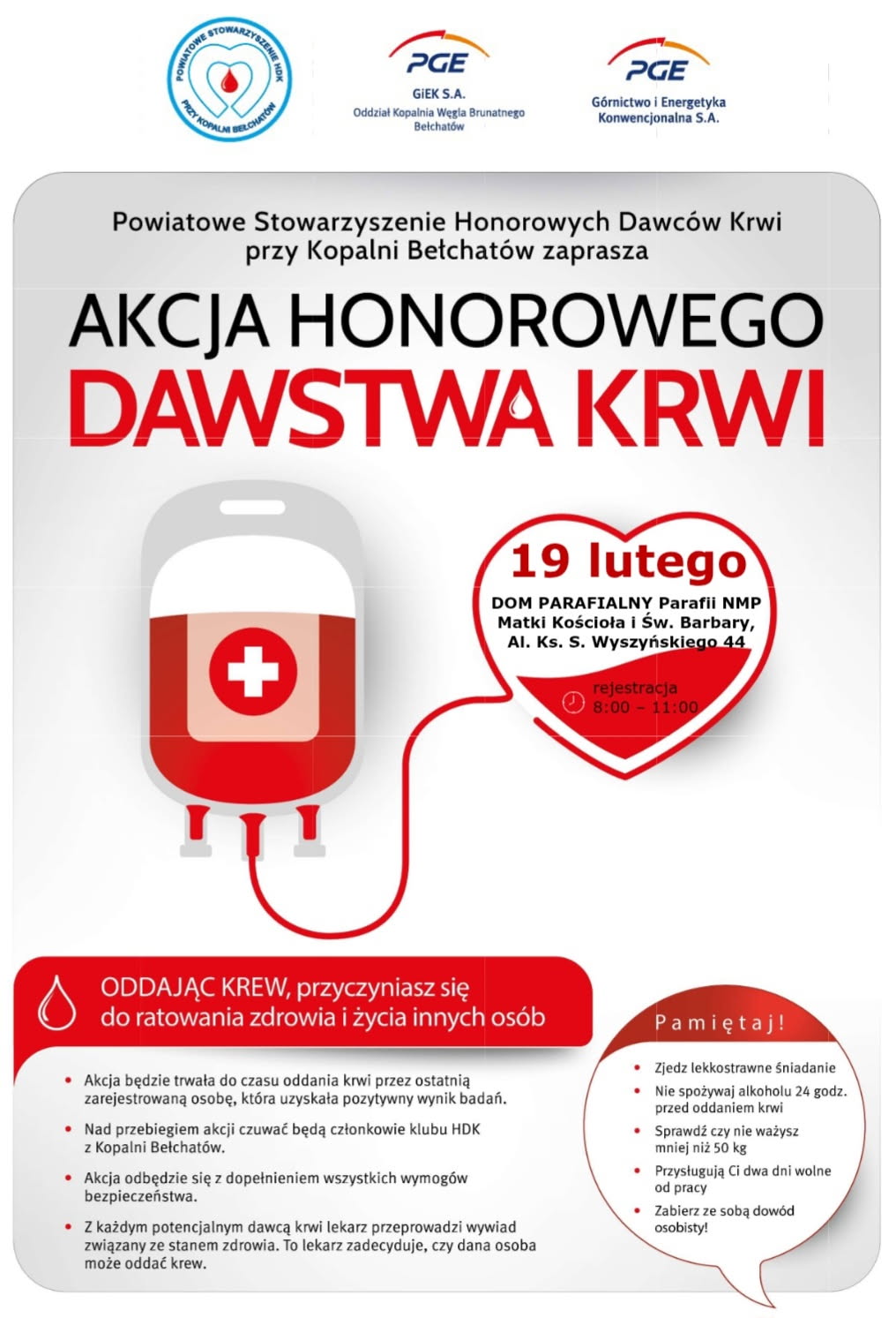 Już 19 lutego w Domu Parafialnym Parafii NMP Matki Kościoła i Św. Barbary, na os. Dolnośląskim w Bełchatowie odbędzie się honorowa akcja krwiodawstwa. Rejestracja dawców potrwa od godziny 8:00 do 11:00. Nad sprawnym przebiegiem wydarzenia czuwać będą członkowie PSHDK Kopalni Bełchatów.