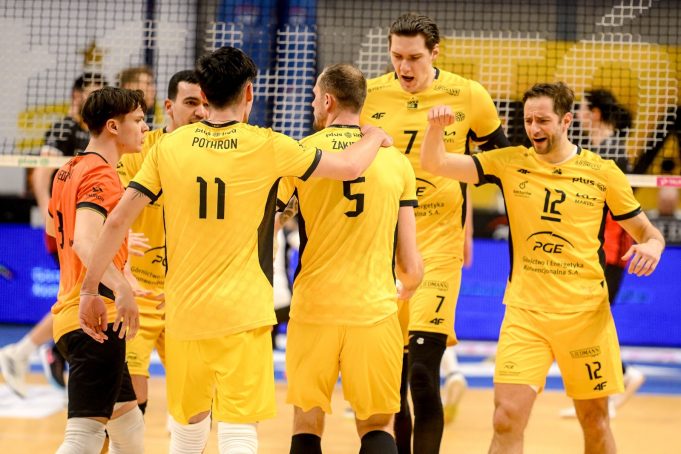 PGE GiEK Skra: El Graoui, Żakieta, Lemański, Pothron, Łomacz, Szalacha, Kędzierski (libero) oraz Szymura (libero), Manavinezhad, Szymendera,