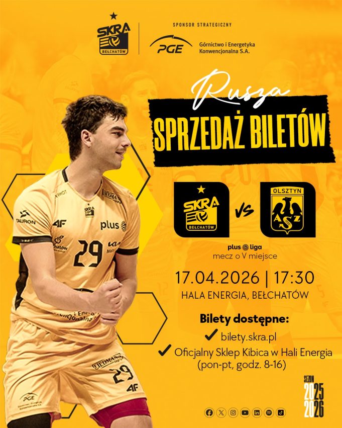 17 kwietnia o godzinie 17:30 PGE GiEK Skra zmierzy się w Hali Energia o 5. miejsce z Indykpolem AZS Olsztyn. Wejściówki na to spotkanie dostępne są on-line oraz stacjonarnie.